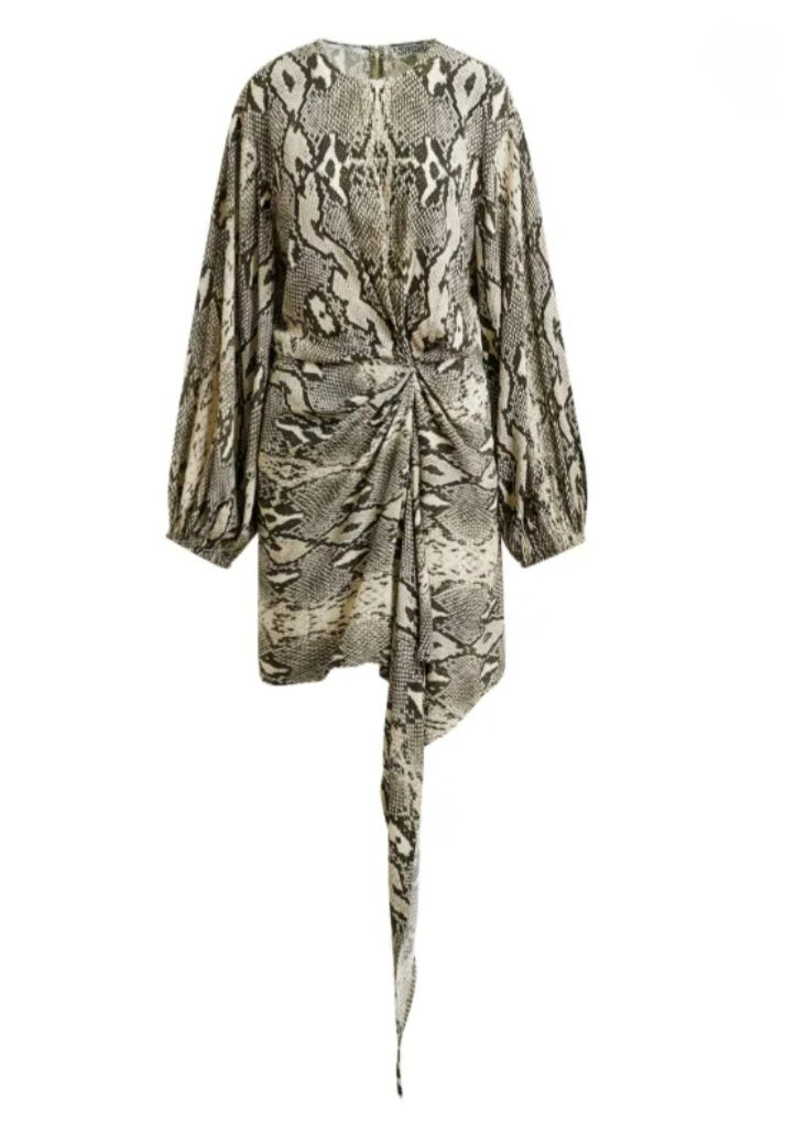 Abito stampa pitone, tessuto leggero, vestibilità rilassata, zip nascosta sul dietro, spalle scese e maniche a palloncino, pannello gonna drappeggiato, parzialmente foderato. 100% viscosa.