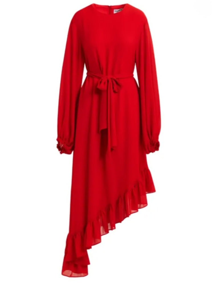 Abito rosso asimmetrico, rifinito con volant a cascata, tessuto medio, vestibilità rilassata, chiusura con zip nascosta, tasche a fessura, maniche a palloncino, foderato, spalle scese. Poliestere ed elastan.