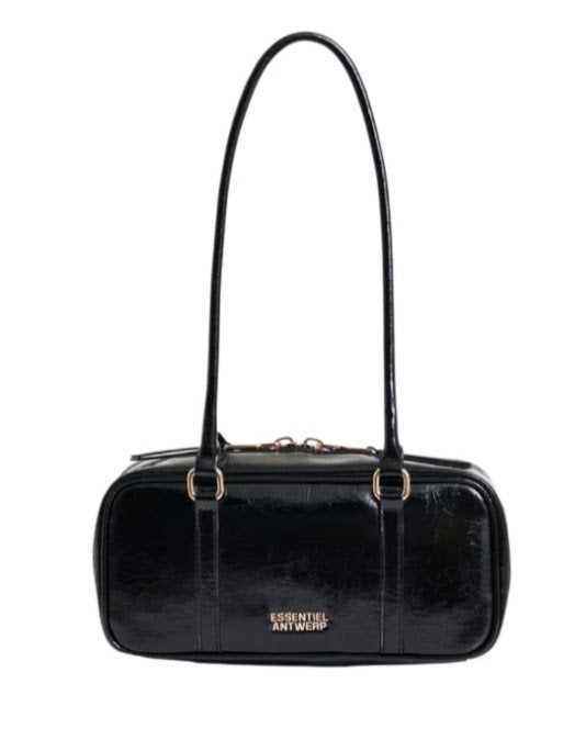 Borsa nera lucida, chiusura con zip, manici superiori, rifiniture in oro, logo sul davanti, completamente foderata. Ecopelle. Cm28x8,5x12,5.