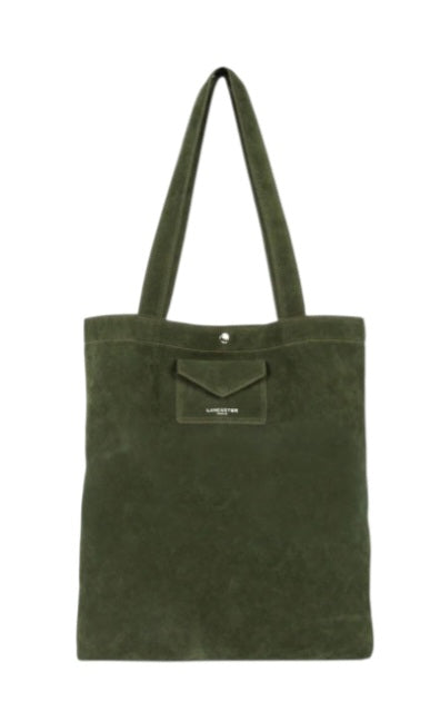 Borsa verde in ecopelle scamosciata, grande tasca interna con zip e portacarte frontale, chiusura con bottone a pressione e si porta a spalla. Cm35x39x4.