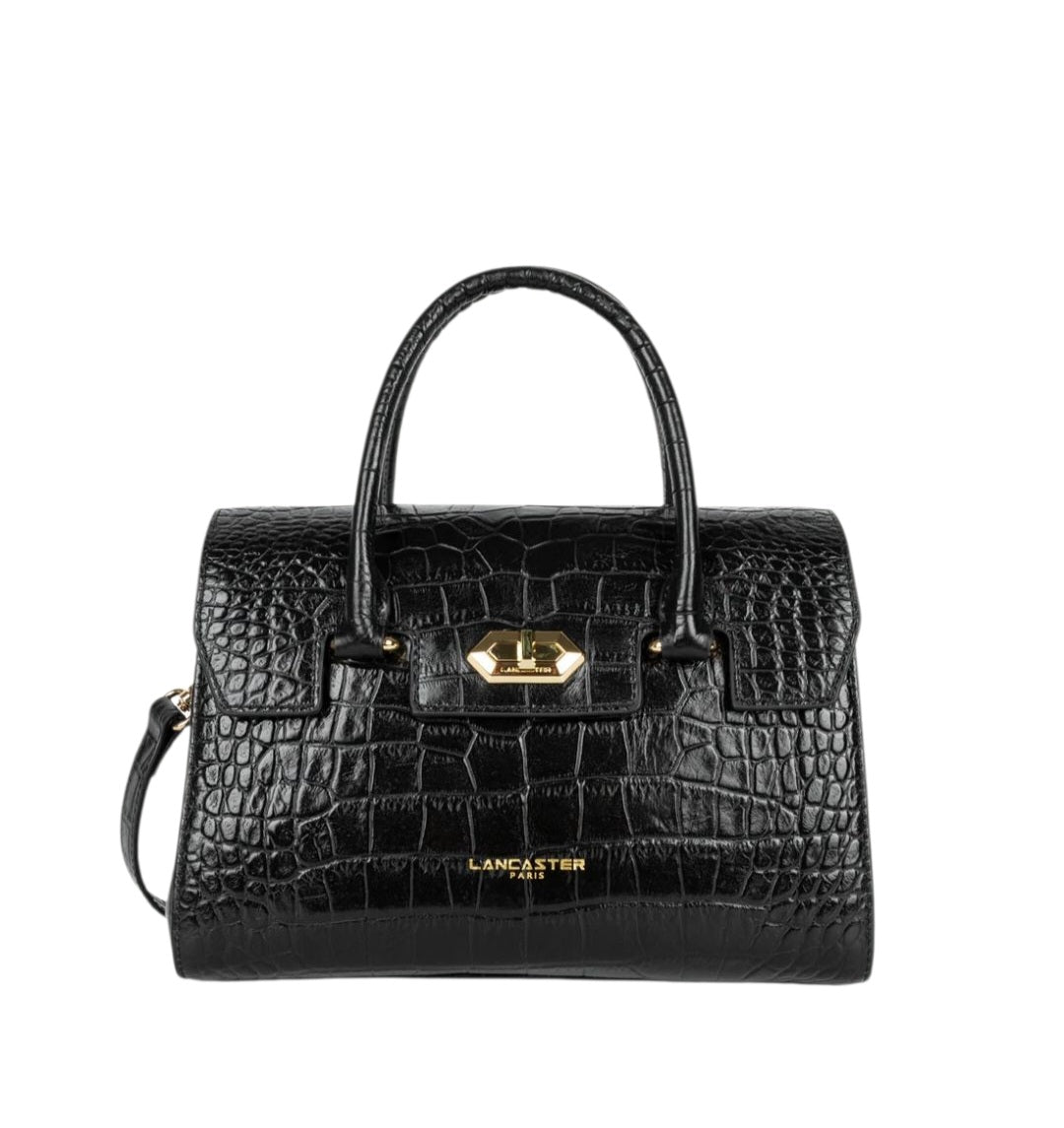 Borsa nera in pelle di vitello granulata, effetto cocco, tasca interna con zip e una semplice, può essere portata a spalla o a tracolla, patta con fermaglio, due manici, tracolle removibile. Cm25x17x10.