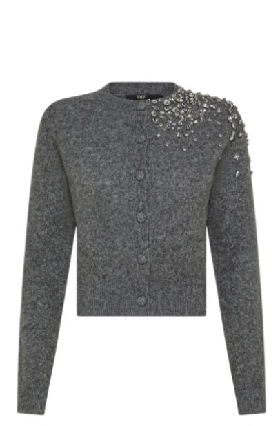 Cardigan grigio melange in alpaca, girocollo, ricamo gioiello in strass, chiusura con bottoni, vestibilità crop e aderente, rifiniture a costine. Lana, alpaca e poliammide.