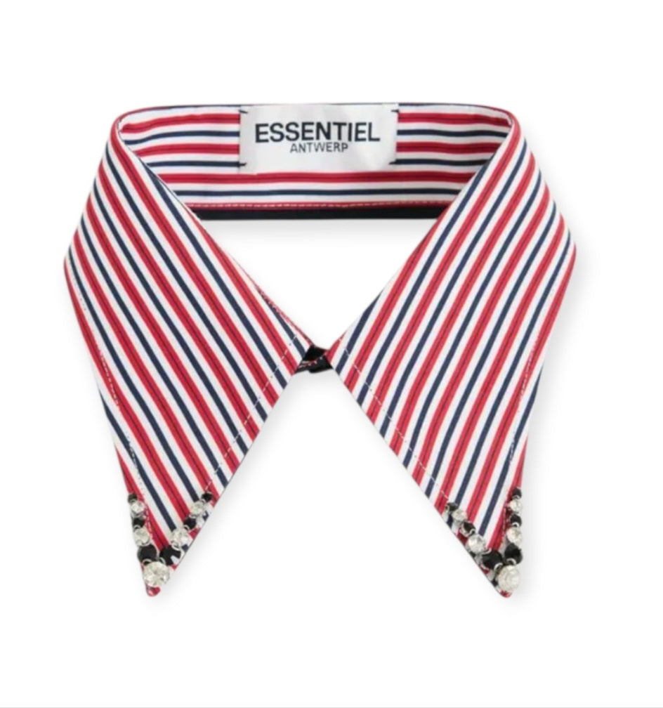 Colletto staccabile a righe blu e rosso, design a punta con strass, chiusura con bottone. 100% cotone.