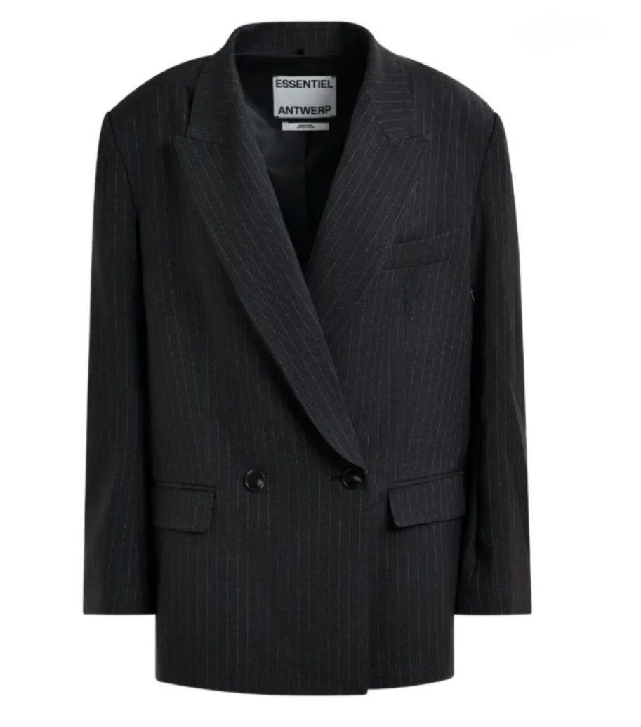Giacca grigio scuro gessata, doppiopetto, vestibilità oversize, revers classici, spalle scese, tasche con patta. Viscosa e poliestere.