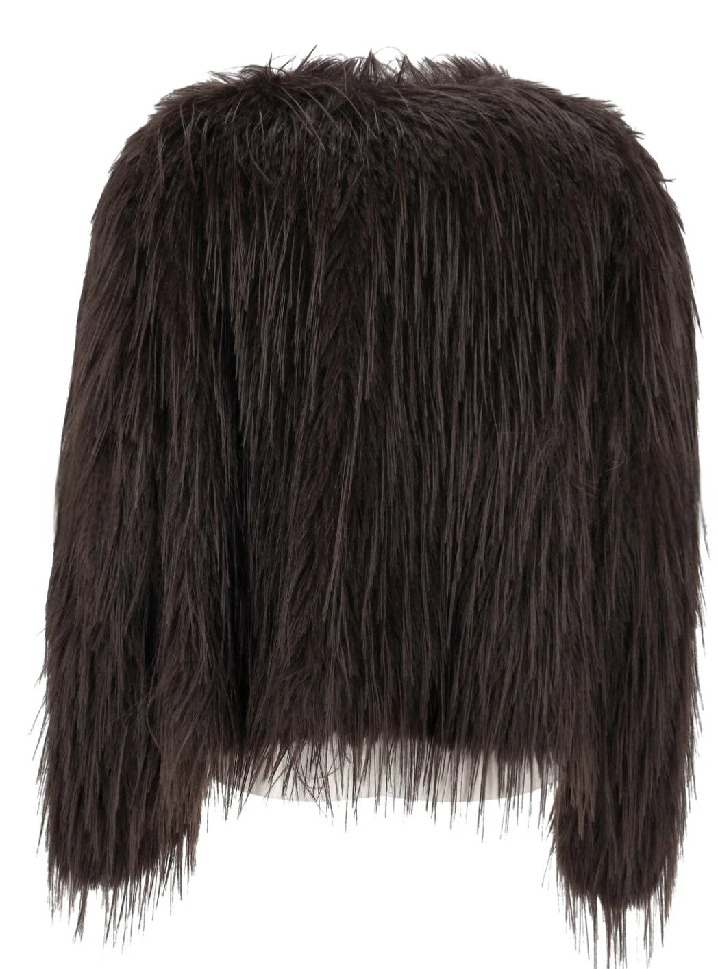 Giacca in ecopelliccia color coffee, foderata, girocollo, manica lunga, vestibilità oversize. Poliestere e viscosa.
