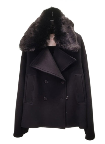 Giaccone nero doppiopetto, colletto in ecopelliccia, revers classici, spalle scese, chiusura con bottoni, tasche a filetto, foderato. Vestibilitá oversize. Lana e poliamide.