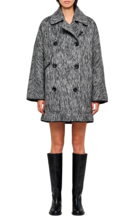 Giaccone color grigio melange, chiusura davanti doppiopetto con bottoni, imbottitura interna, collo revers, vestibilità oversize, tasche con patta sul davanti. Lana e poliestere.
