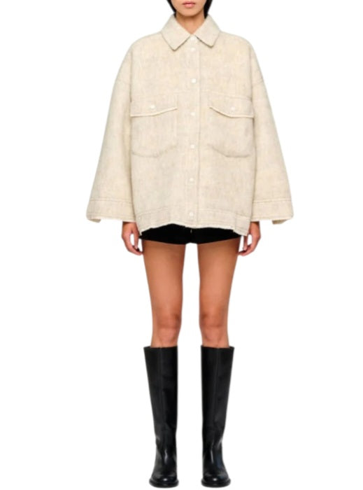 Giaccone color avorio, tasche applicate davanti con patta, effetto peloso, imbottitura interna, maniche lunghe ampie, chiusura con automatici, vestibilità oversize, colletto classico. Poliestere e lana.