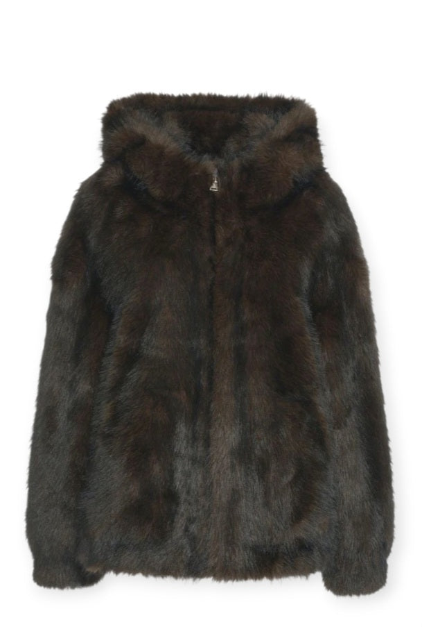 Giubbotto marrone in ecopelliccia con cappuccio, chiusura davanti con zip, maniche lunghe, tasche a filetto sul davanti, vestibilità comoda. Poliestere.