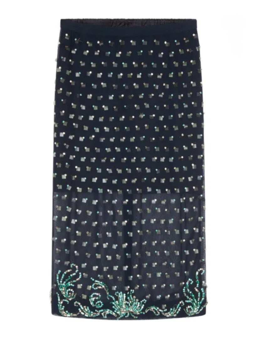 Gonna blu scuro con strass semi trasparente, decorata con perline, motivo geometrico, dettagli ricamati. Viscosa 100%.
