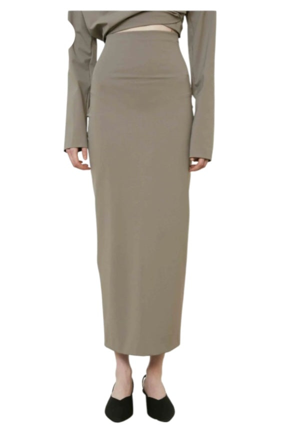 Gonna color fango, tubino con spacco dietro, vestibilitá aderente, elastico in vita, lunghezza caviglia. Poliestere ed elastan.
