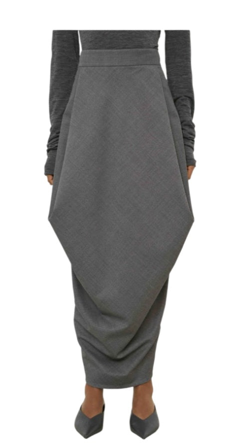 Gonna grigia con drappeggio a pieghe davanti e dietro, tasche laterali, chiusura con zip, tessuto elasticizzato, spacco dietro. Poliestere ed elastan.